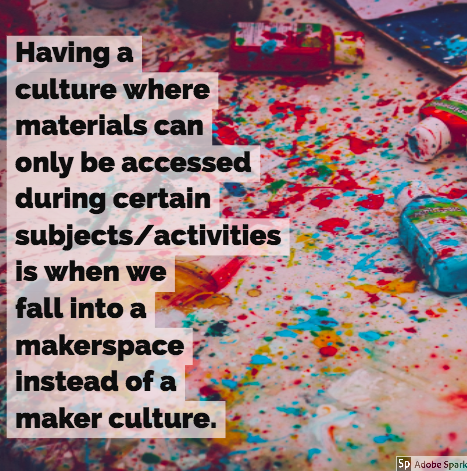 I neglected to mention maker culture, (also known as the maker movement) and that it's more about the philosophy and attitudes than the physical space housing equipment or supplies.