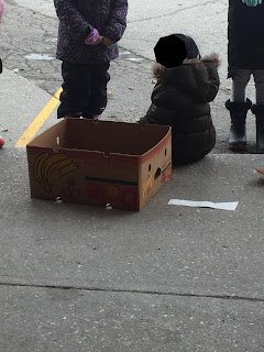 I was the culprit that provided over a dozen boxes for the students to use outside at recess in (almost) whatever way they wanted. Usually, I save boxes for use in my STEAM program and dismantle them to create more storage space. However, one afternoon, I watched two students who were supposed to be working on a STEAM project with cardboard instead play very happily with intact boxes. They sat in them. They drew on them. They stacked them. I stopped them eventually, because when you only have 40 minutes of construction, it's not wise to waste that limited time. Their play planted a seed and when I received a large shipment of donated books in sturdy but dusty banana boxes, I decided to save them for outdoor play.